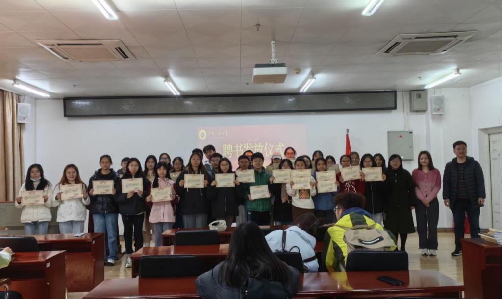 仪式最后,蓝永丽副书记、黄晴老师、王莹莹老师为22届团委学生会成员颁发聘书并合影留念。