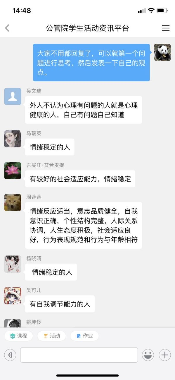 为提高心理委员和寝室长履行职责的理论水平和专业能力,为同学们提供及时有效的心理支持,公共管理学院于11月24日在学习通开展了心理健康知识培训活动,由师军强老师主持,全院心理委员、寝室长共计200余名同学积极参与。