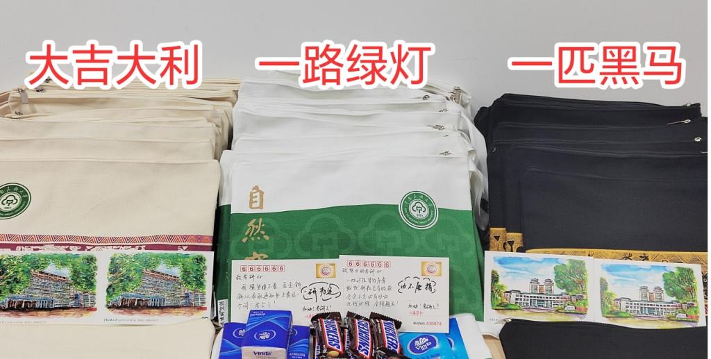 参会领导、老师为学生代表发放了“爱心大礼包”。“爱心大礼包”分为“一路绿灯”“大吉大利”“一匹黑马”三个类别,每类均包括考试文具套装、纸巾、湿巾、士力架和由学院师生手写的明信片,座谈会现场洋溢着温暖的笑容和愉悦的笑声。