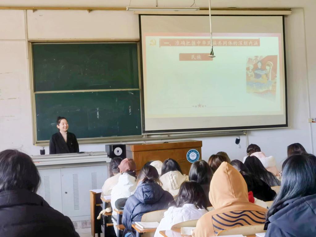 布合力其木·吐逊围绕“以铸牢中华民族共同体意识为主线,推动新时代党的民族工作高质量发展”这一主题,从重要内涵、时代背景和基本任务三方面展开。她从“民族”“中华民族”和“中华民族共同体”的含义和联系出发,以浅显易懂的语言讲述了三者的重要性,并围绕民族地区的社会变化、政治制度、历史任务等内容与同学们进行了交流讨论。她指出,铸牢中华民族共同体意识是新时代青年共同的使命担当,我们必须自觉维护民族团结、共同促进祖国繁荣发展,为建设新时代中国特色社会主义贡献青春力量。