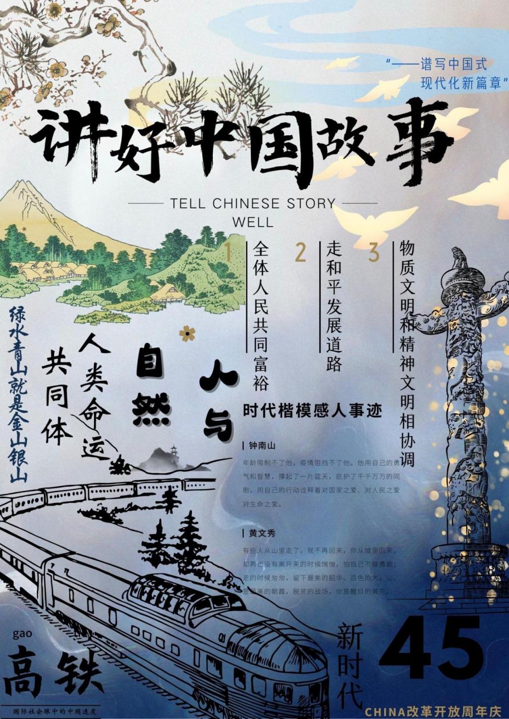 公共管理学院基层团校一班的实践课作品以“讲好中国故事”为出发点,加入中国高铁、梅花、华表等元素,以蓝白底色为背景,传达了中国式现代化的发展道路提倡多元文化交流与对话的深刻内涵。