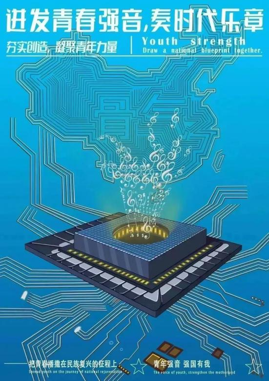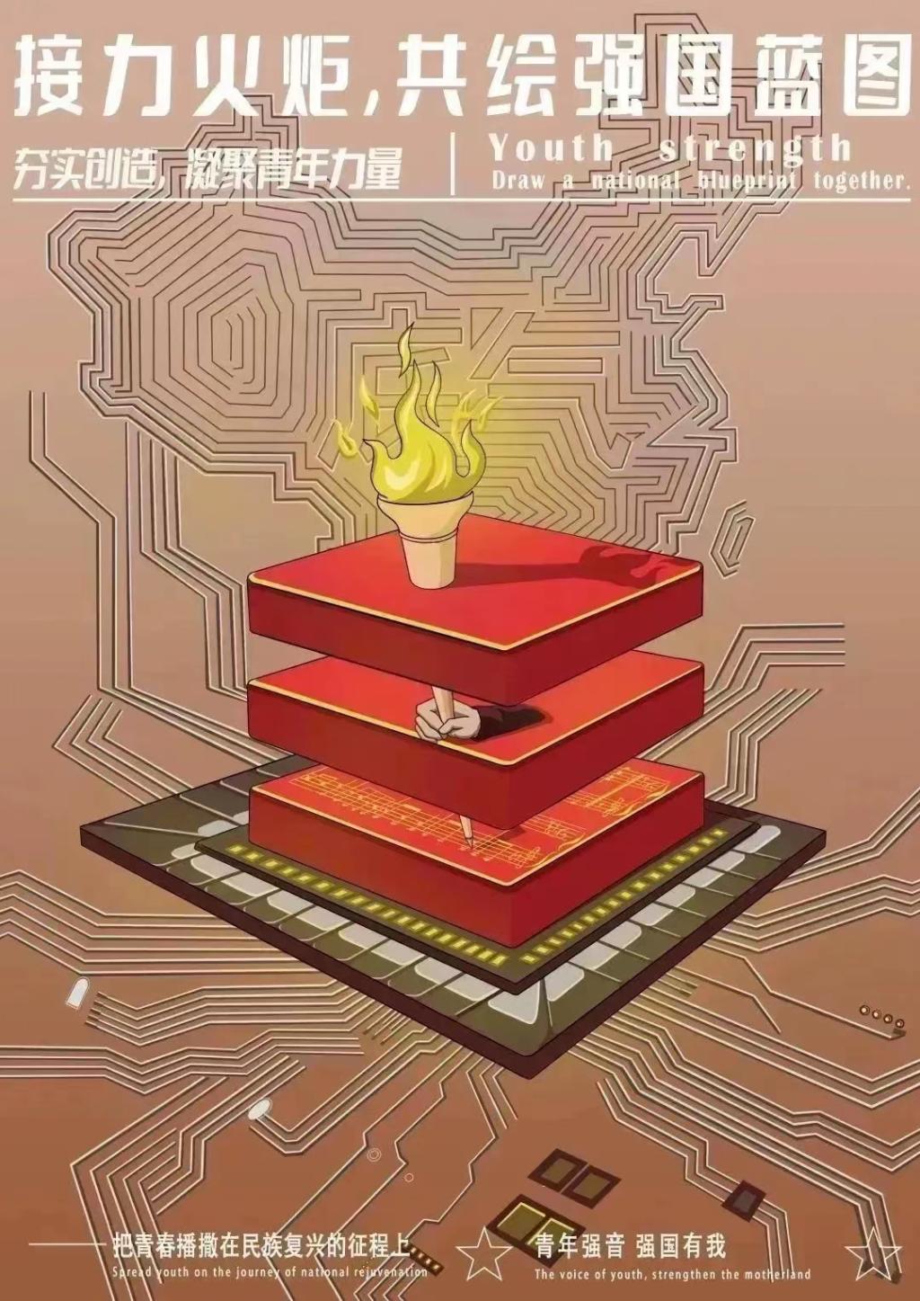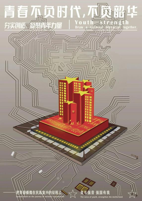 公共管理学院基层团校四班的中国式现代化实践课系列作品,从青春的视角出发分为三个总模块,展示了中国式现代化发展之路中,青春力量发挥着顶梁柱的作用。三幅海报构图层次丰富,关联性强,给人强烈的科技感与冲击力。