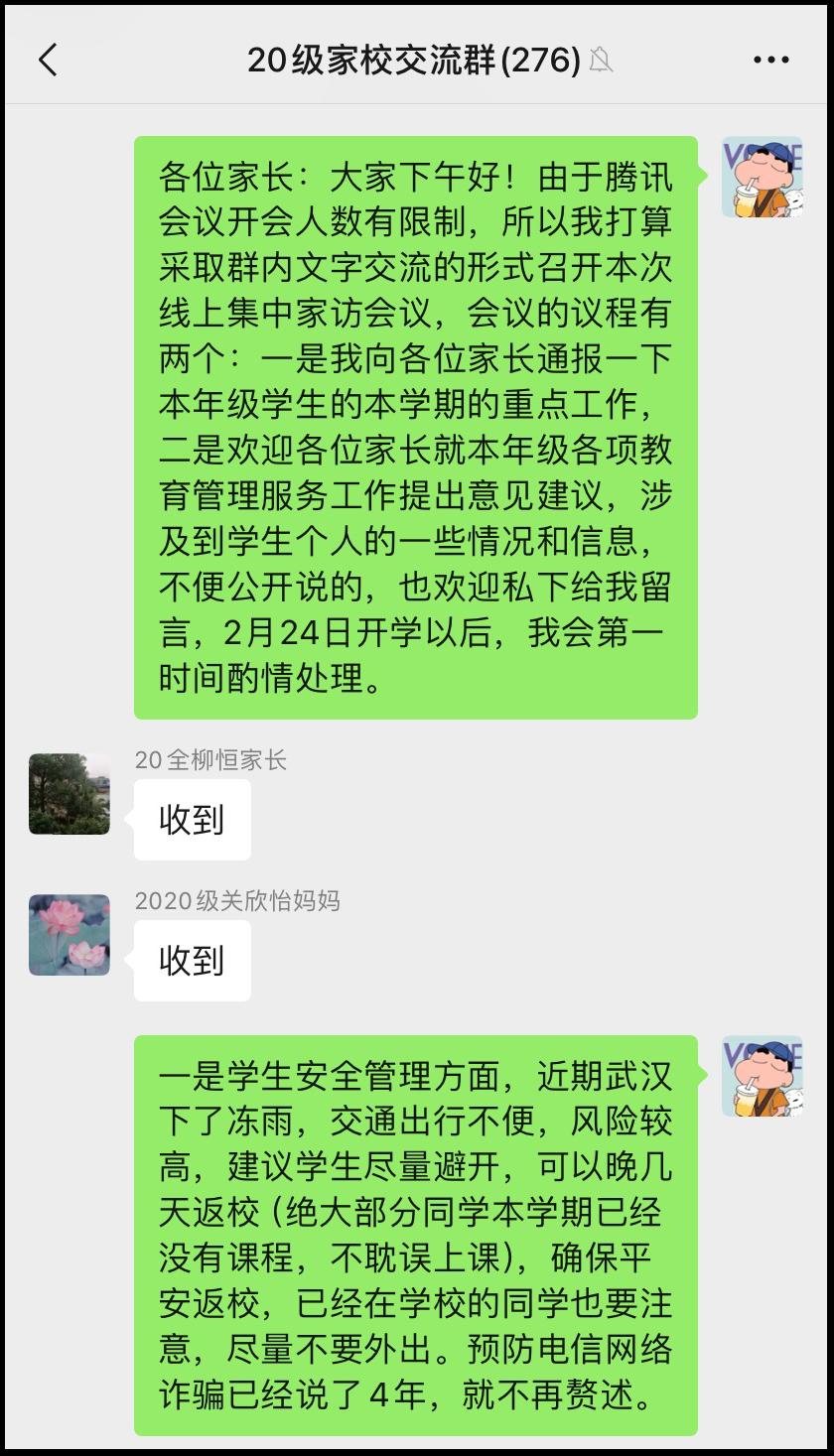 为推进公共管理学院毕业年级工作深入开展,持续加强家校联合育人工作,2月22日,20级辅导员师军强老师在家校交流微信群召开了线上集中家访工作会议,20级本科生全体家长参加会议。本次线上家访会议分为两个议程,一是2020级专职辅导员师军强向全体家长介绍和通报了2020级本科生在本学期的重点工作,二是与会家长对2020级的各项教育管理服务工作提出意见和建议。