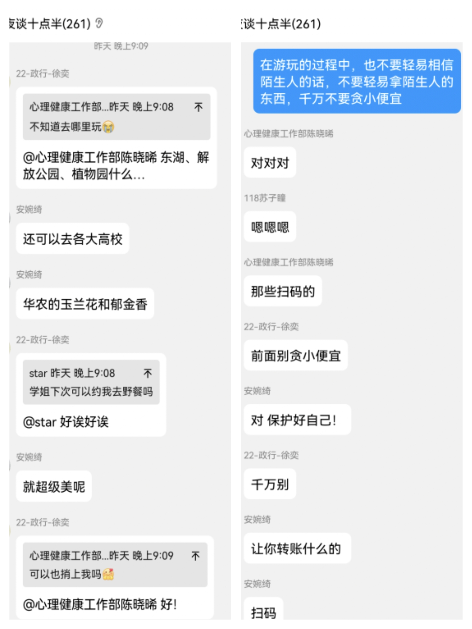 本期活动共有四个环节,特邀嘉宾安婉绮和徐奕学姐为大家答疑解惑,并分享自己的生活和看法。第一个环节大家分享了自己对武汉的印象,畅聊了自己来到武汉求学的原因;第二个环节中大家聊的十分火热,表达了自己对于武汉的喜欢,有人陶醉于武汉美丽的环境,有人热爱武汉的美味小吃,还有人欣赏武汉的独特文化...在第三个环节中大家结合自己的生活,分享了自己在武汉的游玩经历和游玩感受,两位学姐还热情的向大家推荐游玩地,交流氛围和谐融洽;在最后一个环节中,强调了游玩过程中的安全问题,大家纷纷提出了自己的游玩小建议,从交通、财务、个人隐私等各个方面强调了安全的重要性。