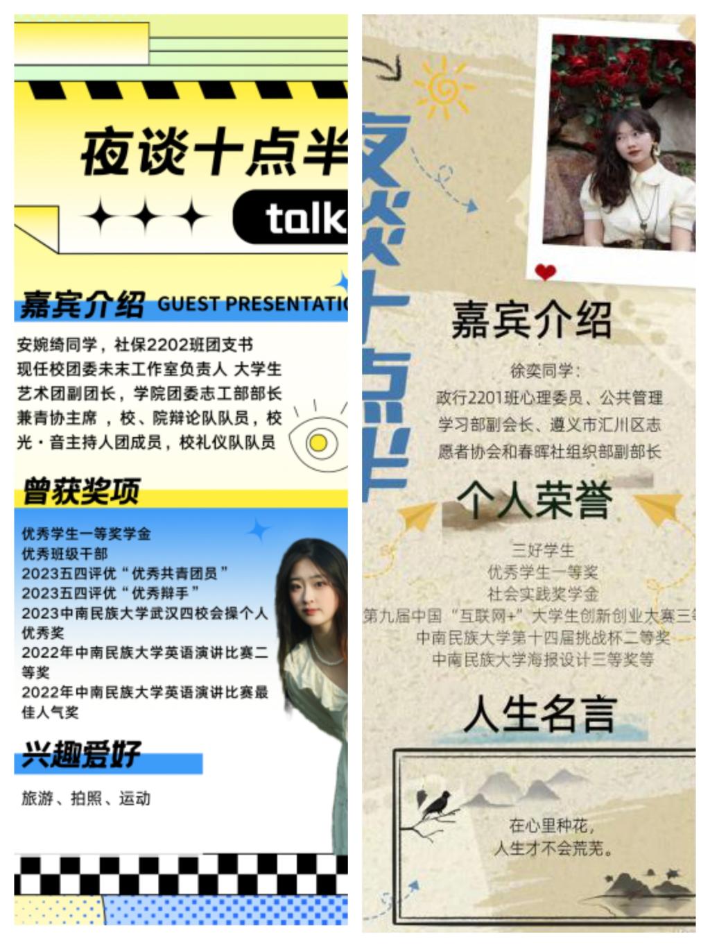 本期活动的结束为整个夜谈十点半活动画上了一个完美的句号。从第一期对“落差感”的探讨中,大家明白了落差感也是我们人生旅程中不可或缺的一部分,它教会我们如何面对挫折,如何调整心态,更加珍惜现有的成就,无论我们在人生的哪个阶段,都不要害怕面对落差感,因为正是这些起起落落,让我们的人生更加丰富多彩;从第二期对“高效学习和综测焦虑”的探讨中,我们学到了高效学习的方法,了解了综测,为自己的生活和学习又注入了能量,学会了无论是紧张,还是焦虑,都应放平心态看待这些跌宕起伏,一重山有一重山的错落,我有我的平仄,把握好生活的节奏,才能活得更精彩;在第三期活动中,大家又对“游玩武汉之旅”展开了热烈的讨论,并且收获很多心得体会。一期活动,一期欢声笑语,一期独特的心灵之旅。
