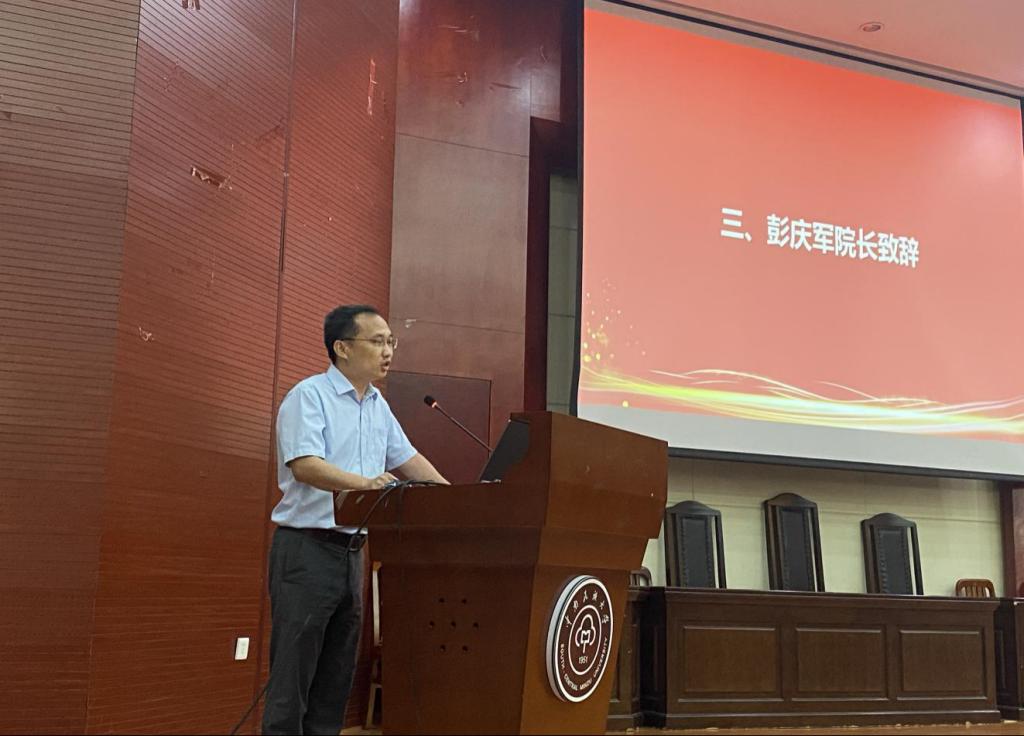 彭庆军院长致辞,他回顾了学院的发展历程,展望了未来的美好前景,鼓励新生们要志存高远,脚踏实地,努力学习专业知识,积极参与社会实践,全面提升自己的综合素质,为实现个人价值和社会进步贡献自己的力量。