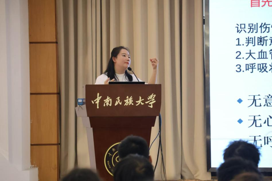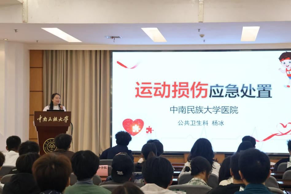 为加强学生安全防护意识,提升学生群体对运动安全的认识,增强其在运动中突发伤害时的急救能力,10月19日上午,学工部联合校医院在校学术交流中心润良报告厅开展运动安全急救知识培训。本次培训邀请了校医院公共卫生科主治医师、武汉大学公共卫生硕士杨冰老师为大家进行讲解和演示相关知识技能,各学院院级学生运动团队学生负责人共220人参与培训。