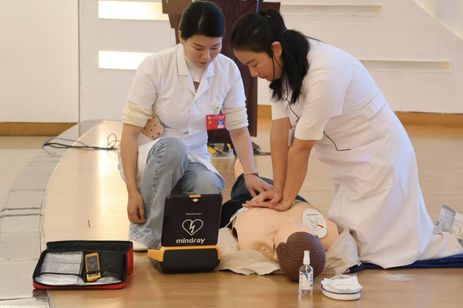 杨冰老师以通俗易懂的方式讲解了海姆立克急救法和心脏复苏术的应用,并用两个简单的口诀“剪刀石头布、拍五按五”来普及海姆立克急救法。此外,她还与同事一起现场演示了标准的海姆立克急救法和心脏复苏术。