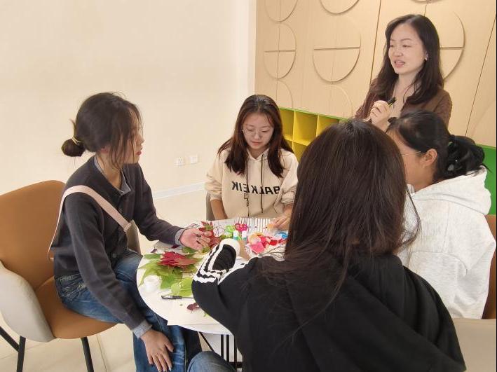 张雪花老师与学生交流手工的创意和想法 化学与材料科学学院 供图