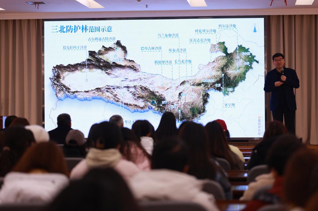 讲座中,吴向伟老师通过生动的讲述和真实的案例,用“星光林”“科学治沙的探路人——人民楷模王有德”等多个故事向我们讲述了“种树植心”的深刻内涵。他提到,种树不仅仅是为了改善环境,更是在人们心中种下一颗绿色的种子,让环保意识生根发芽。同时,吴老师播放的纪录片也让我们更加直观地了解到在沙漠植树造林的艰辛不易,同时也看到了在荒漠化地区增加植被覆盖率具有防风固沙、调节气候的巨大作用。