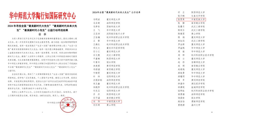 近日,华中师范大学教育学院、华中师范大学陶行知国际研究中心主办的寻找全国“最美新时代未来大先生”公益评选活动结果揭晓,教育学院2024级教育学专业研究生向伟和2022级教育学专业本科生张雯果荣登榜单。她们以陶行知先生的教育理念为指导,积极投身教育实践,以优异的表现展示了新时代教育学院学子的风采。
