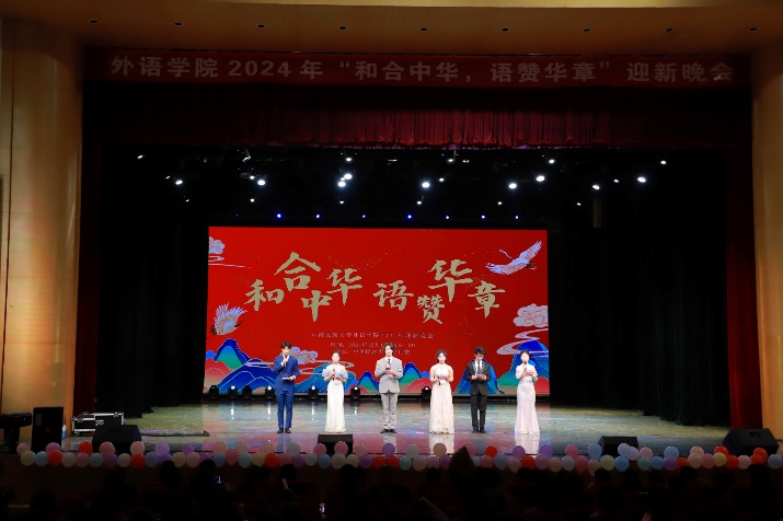 12月8日晚,外语学院“和合中华 语赞华章”迎新晚会在大礼堂成功举办。外语学院领导班子成员、全体辅导员、班导师代表、全体新生、各年级学生代表和兄弟学院团学干部代表齐聚一堂,共同见证这场青春盛宴。