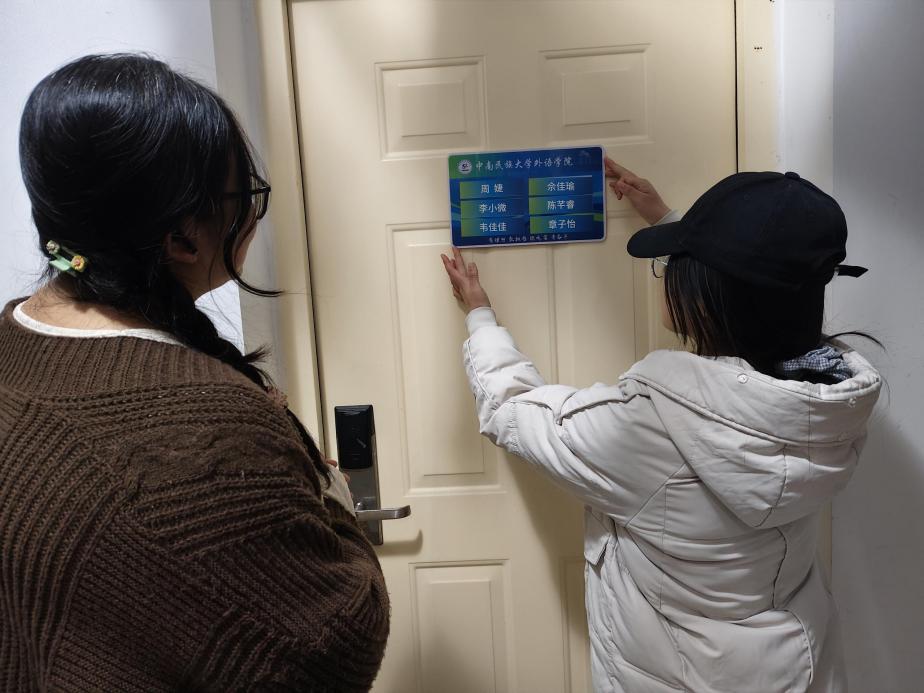 全院联动,共建和谐共融“温馨小家”。外语学院为全院200余间寝室设计制作了印有学院院徽的精美门牌,并由各宿舍成员共同完成挂牌仪式,粘贴姓名、合影留念。