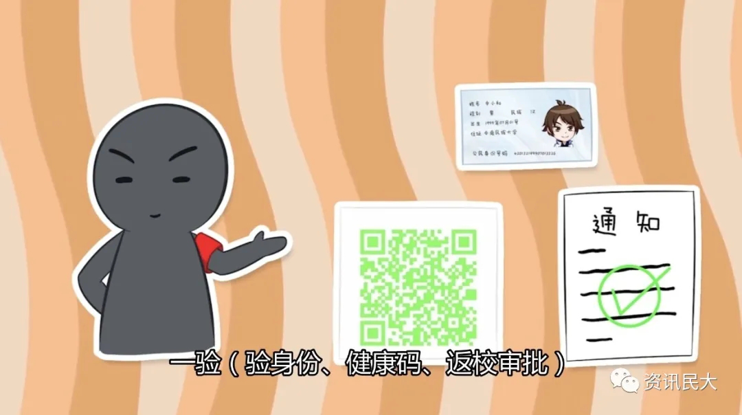 返校途中注意事项。 1.做好旅途防护。乘坐公共交通工具时,须全程佩戴口罩,保持双手卫生,勤洗手。 2.记录返校行程。保留好所有公共交通工具的票据、付款记录,记载搭乘时间、班次和地点,以配合可能的相关密切接触者调查。 返校当天注意事项。 1.毕业生接站。学校在武昌、武汉、汉口三个火车站安排接站车辆,同学们可以前往免费乘坐。 2.通过南一门、正大门、北二门出入。其他校门封闭。 3.送客车辆即停即走。按照上级有关疫情防控工作要求,乘坐私家车或有亲友陪同返校的同学,车辆和亲友送至校门口即停即走,不进校园,配合交警部门指挥,避免造成校门前道路拥堵。校内提供通勤车辆,帮助学生运送行李。 4.返校报到流程。进入校门前,在指定通道依次排队且间隔1米以上,避免拥挤,凭「湖北健康码」、「民大微码」及有效证件(身份证、校园一卡通),经人脸识别、体温检测正常后进入学校。