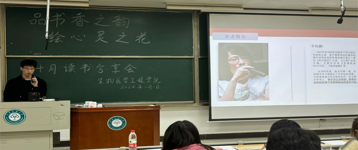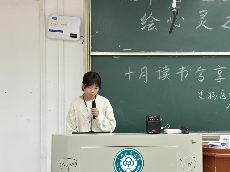 第二位分享者是来自生医2301班的韦知行同学。她为我们带来了一本深刻且富有启发性的书籍——《蛤蟆先生去看心理医生》。这本书通过讲述一只深陷抑郁情绪中的蛤蟆先生与其心理咨询师苍鹭之间的对话,深入探讨了心理健康的重要性。韦知行同学结合自己的亲身经历,真诚地分享了她的感受与见解。她鼓励在座的每一位同学:不要因为羞耻而隐藏自己的问题,而应该勇敢地寻求帮助,学会接纳并拥抱真实的自己。