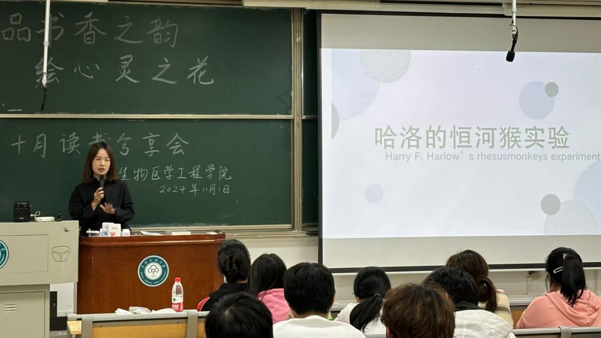 叶颖老师首先分享了罗杰·霍克写的《改变心理学的40项研究》,并就其中哈洛的恒河猴实验展开细致分享。该实验通过对比铁丝母猴与绒毛母猴对幼猴成长的不同影响,深刻揭示了身体接触在幼猴成长过程中的不可或缺性,其重要性甚至超越了哺乳本身。她借此契机,勉励同学们不仅要言辞上表达爱意,更要在行动上付诸实践,向亲朋好友传递温暖与关怀。