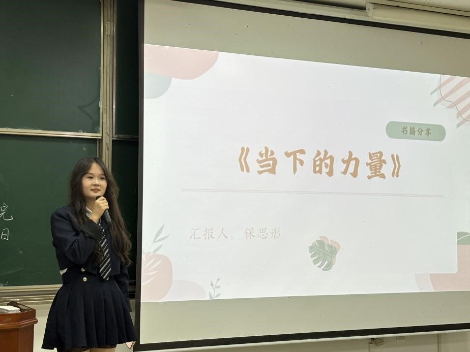 第一位分享者是生医类2403班的的保思彤。她分享了《当下的力量》一书,介绍了书中认清时间幻象的几个非常实用的方法,放平心态、珍惜现在、享受过程,感受日常生活中简单的美好与幸福。她感悟到:“活在当下,当下有你所有想要的东西,当下也是你唯一拥有的东西”。