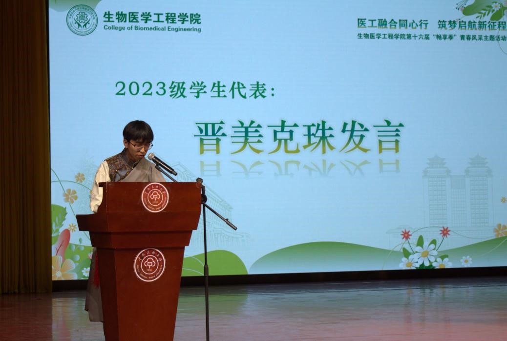 活动聚焦生物医学工程学院服务高海拔寒冷地区医疗健康事业工作主题,特邀三位来自西藏及周边地区的学生代表依次发言。他们讲述了家乡医疗资源匮乏的现状,以及怀揣“用专业知识反哺家乡”的坚定信念,立志在高原医学领域攻坚克难、贡献力量。发言中,学子们将个人理想与医疗健康事业紧密结合,彰显生医学子服务国家战略的责任担当。