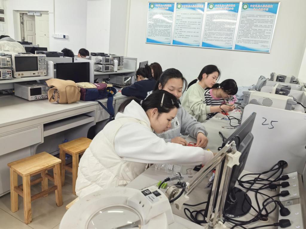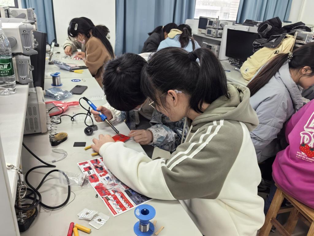 低年级组团队成员间默契配合,在罗媛媛老师的专业指导下,同学们专注于电路板的搭建与调试。比赛现场,同学们沉着应战,充分展现出团结协作的精神。