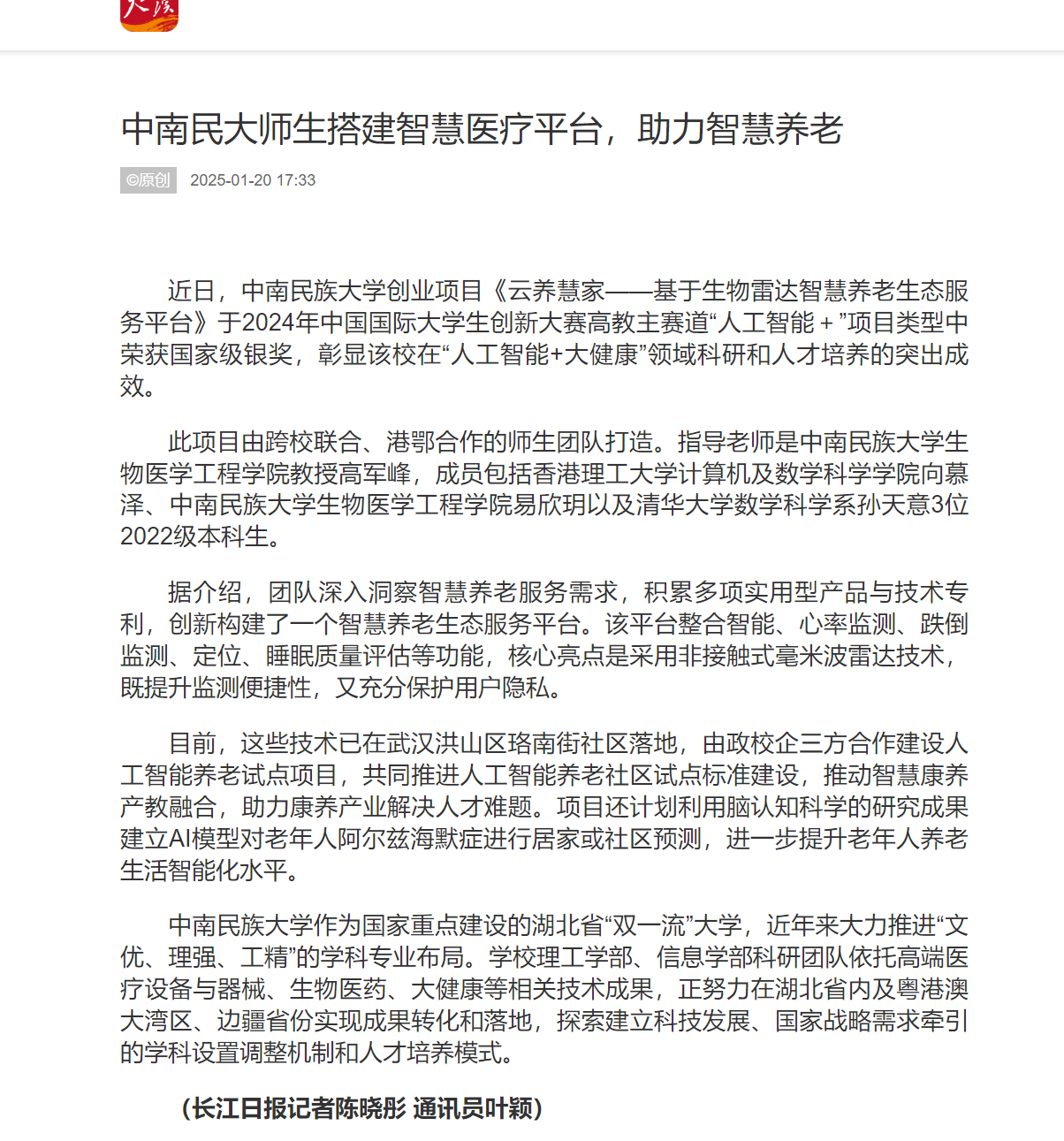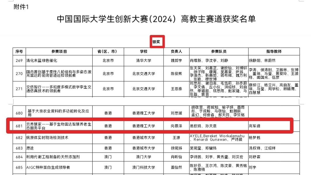 近日,根据教育部关于公布中国国际大学生创新大赛(2024)获奖名单的通知,由beat365官网生物医学工程学院高军峰教授独立指导的创业项目《云养慧家——基于生物雷达智慧养老生态服务平台》在高教主赛道“人工智能+”项目类型中荣获国家级银奖,是beat365官网在该竞赛中所获的最高奖项。彰显beat365官网在“人工智能+大健康”领域科研创新和人才培养的突出成效。