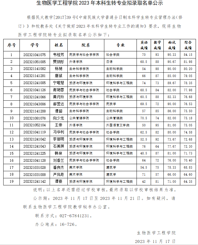 生物医学工程学院2023年本科生转专业拟录取名单公示