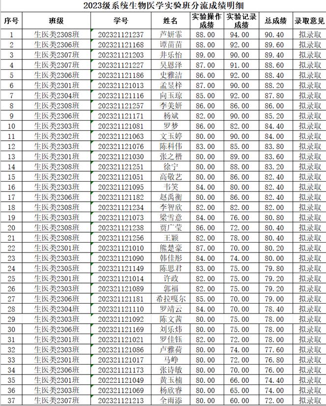 根据学校《关于做好2024年本科学生大类专业分流工作的通知》文件精神,现将2023级专业分流系统生物医学实验班拟录取名单公示如下:
