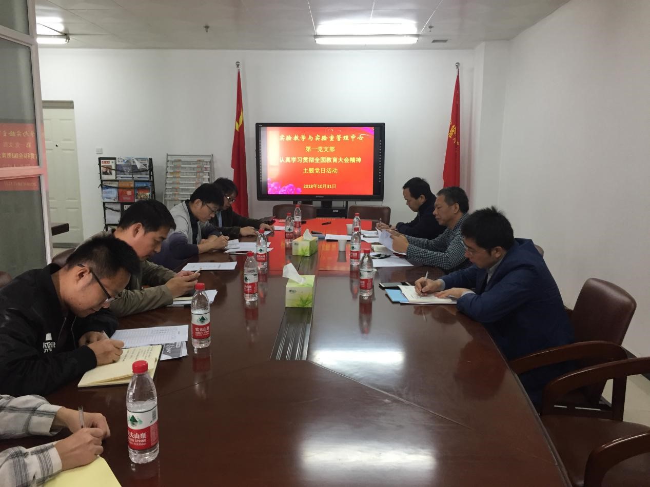 10月31日上午,实验教学与实验室管理中心第一党支部在16-417开展主题党日活动,围绕“认真学习贯彻全国教育大会精神,为学校‘双一流’建设发展凝心聚力”主题,学习重要文献、交流实践心得,不折不扣落实学校《2018年10月份支部主题党日指导主题(全国教育大会精神专题)》各项要求。