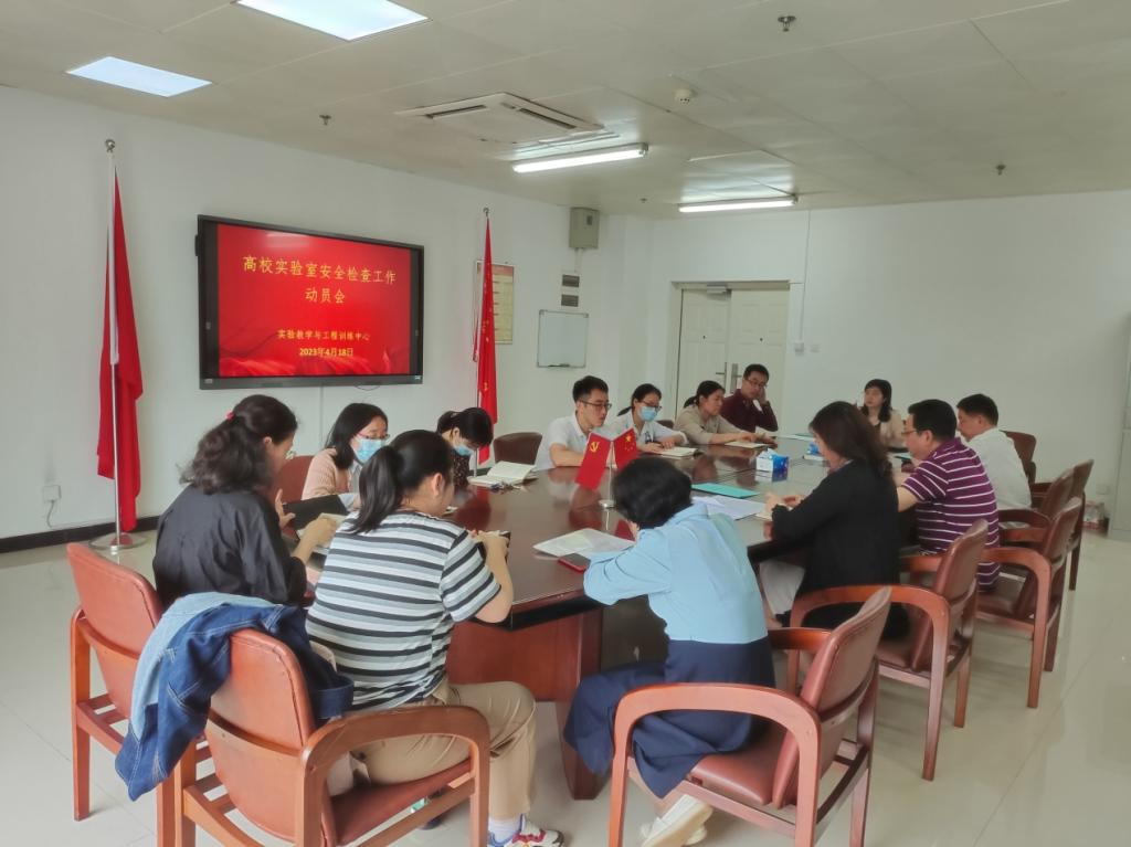 为深入贯彻落实党中央、国务院关于安全生产工作的决策部署,确保实验教学与工程训练中心实验室有序运行,保障广大师生人身安全和校园稳定,现根据学校《关于组织开展迎接教育部2023年高校实验室安全飞行检查的通知》要求,2023年4月18日上午,实验教学与工程训练中心召开高校实验室安全检查工作部署动员会,中心党总支书记蓝华荣、副主任于艳华、贺军,以及实验教学与管理科、化生药实验教学中心、电子信息实验教学中心、经济管理实验教学中心、实验动物中心负责人,实验室主任参加了本次会议。