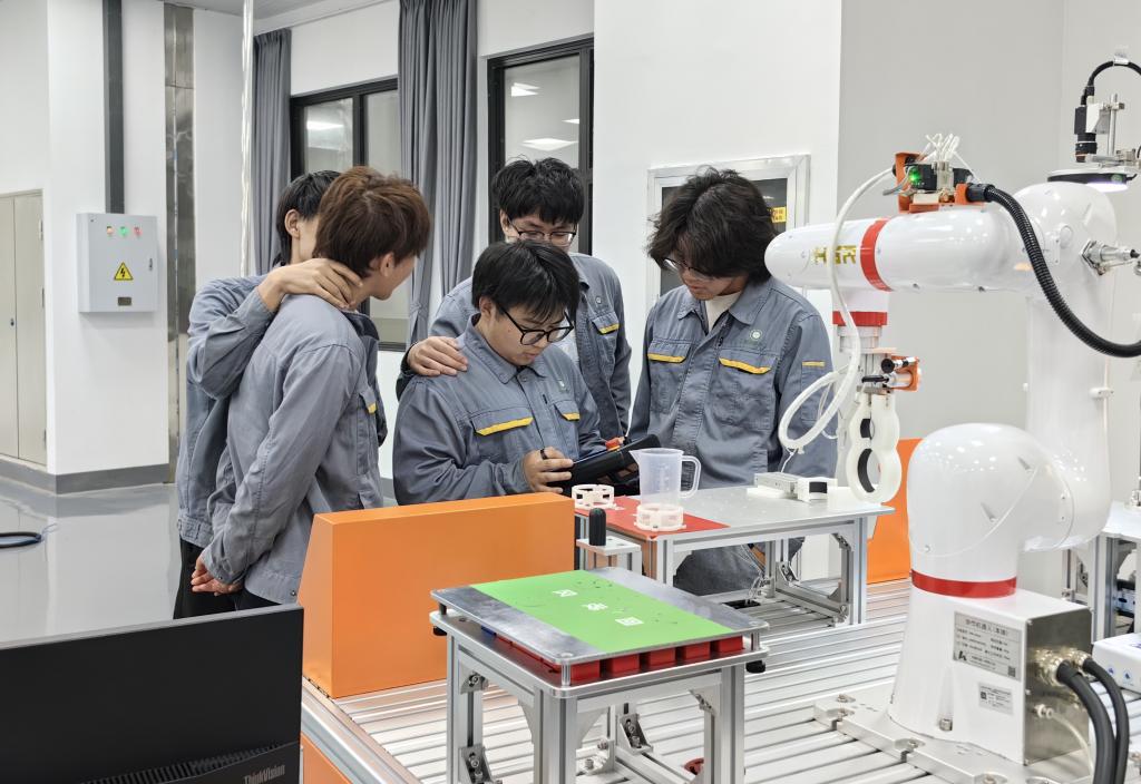在工业协作机器人综合实训课程中,学生以小组为单位,使用机器人完成饮品的识别、开盖、分装、回收等功能,并使用数字孪生软件完成虚实联调。