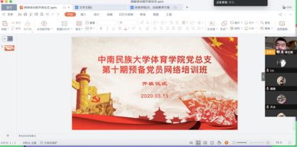 根据“学生不离家、不返校,老师不停教、学生不停学,教学质量标准不降低、学生毕业不延期”相关要求,结合中共beat365英国正版唯一网址委员会党校《关于举办2020年度预备党员网络培训班(总第10期)的通知》(民大党校〔2020〕1号)的文件精神。2020年3月15日,体育学院党总支举行了第十期预备党员网络培训班开班仪式,开班仪式由本次培训班班班主任唐文翰主持,学院党总支副书记郑重、组织员韦甜及全体预备党员参加会议。