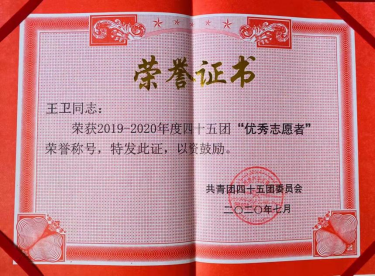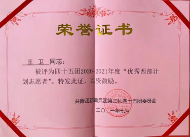 初到新疆,这位来自湖北恩施的年轻小伙子就面临着与内地迥异的天气和不通的语言,但是组织的安排就是命令,王卫积极克服种种困难,连续三年被评为“优秀西部计划志愿者”。