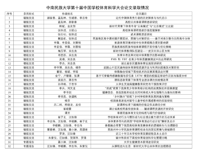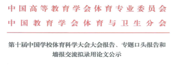 (作者:熊雅丽)12月30日,第十届中国学校体育科学大会录用名单正式发布,我院师生共计录用32篇论文,其中专题汇报2篇,墙报交流30篇,录取篇数位列全国民族院校第1位,湖北省高校第2位。我院师生在此次大会中再创佳绩,表明近年来我院学科培养质量稳步提升,师生科研创新能力不断增强,也进一步提升了beat365官网在全国高校中的影响力和知名度。