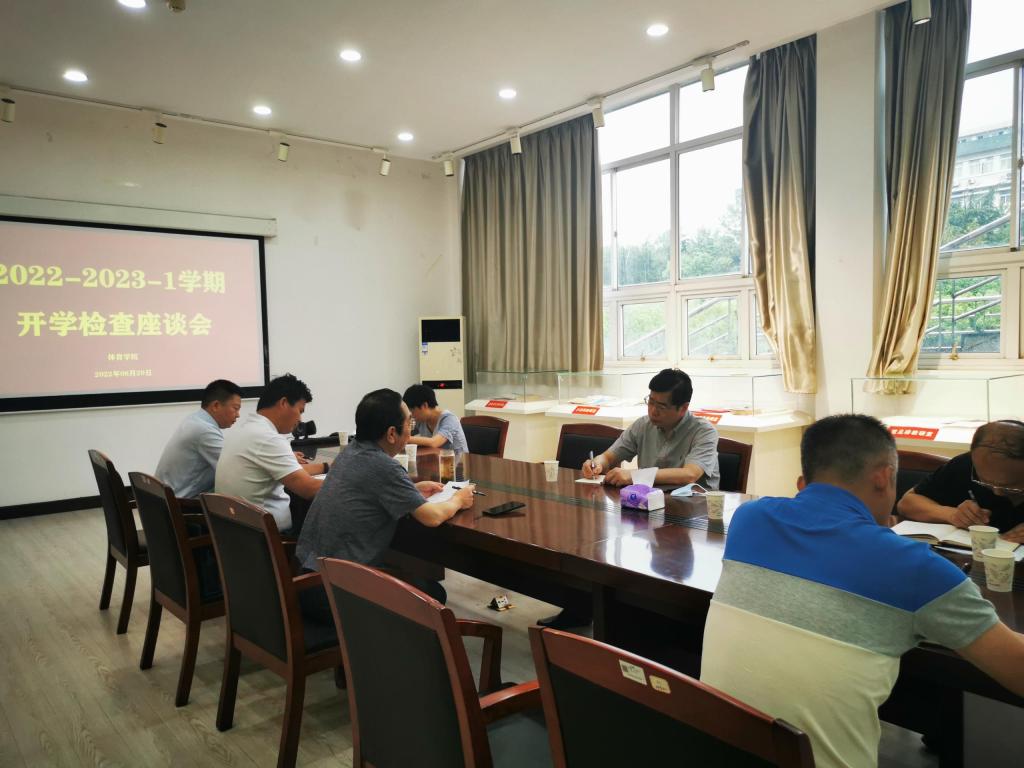 听课结束后,在体育学院荣誉室召开了新学期开学检查座谈会。杨骞书记代表学院对李金林校长的莅临指导表示热烈欢迎。郝家春院长从师生基本构成、返校数据统计、暑期主要工作、开学准备情况、重点工作安排以及存在主要问题等方面进行了较为全面的汇报。体育学院副书记郑重、副院长韩斌、范石汉分别就分管工作做了简要汇报。