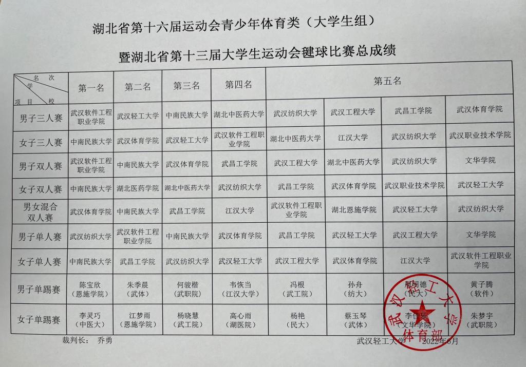 (作者:杨艳)6月25日至26日,2022年湖北省第十六届运动会青少年体育类(大学生组)暨湖北省第十三届大学生运动会毽球比赛在武汉轻工大学金银湖校区体育馆举行。beat365官网毽球队16名运动员在领队郝家春、教练员金宁的带领下,经过两天的激烈角逐,在所有9个项目的比赛中,荣获女子三人赛、女子双人赛和女子单人赛3项冠军;男子双人赛、男女混合双人赛2项亚军;男子三人赛、男子单人赛2项季军;男子单踢赛和女子单踢赛第五名的优异成绩。