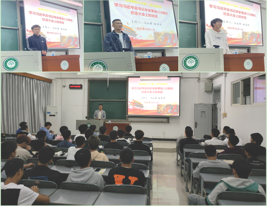 (通讯员:崔子玄)“城头举火起枪声,百世龙楼一夜倾。取义将军舍生死,翻天黎庶铸光荣”。2021年10月11日,体育学院2020级1-2班全体同学参加了以“关于学习习近平总书记在纪念辛亥革命110周年大会上的讲话”为主题的班会,班会由班导师汪如锋老师的主持。汪老师与同学们一起学习了习近平总书记的重要讲话。习近平总书记指出,孙中山先生和辛亥革命先驱为中华民族建立的历史功绩彪炳千秋!在辛亥革命中英勇奋斗和壮烈牺牲的志士们名垂青史!辛亥革命永远是中华民族伟大复兴征程上一座巍然屹立的里程碑!新的征程上,我们必须大力弘扬爱国主义精神,树立高度的民族自尊心和民族自信心,铸牢中华民族共同体意识,紧紧依靠全体中华儿女共同奋斗,坚持大团结大联合,不断巩固和发展最广泛的爱国统一战线,广泛凝聚中华民族一切智慧和力量,形成海内外全体中华儿女万众一心、共襄民族复兴伟业的生动局面。