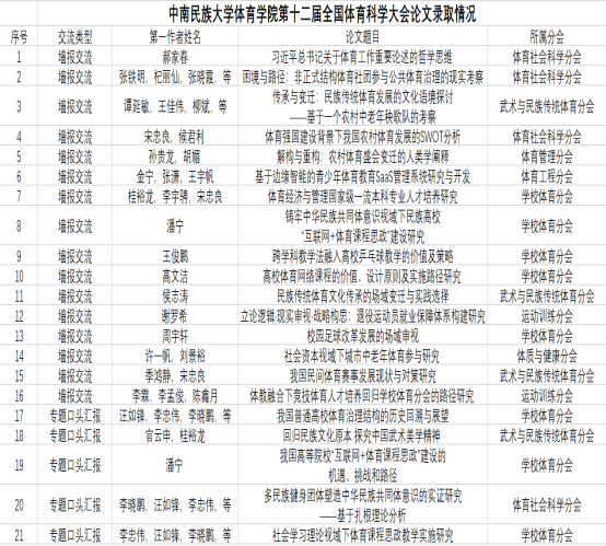 (作者:熊雅丽)9月30日,第十二届全国体育科学大会论文录用结果发布,我院教师及学生共录取21篇论文,其中专题口头汇报5篇,墙报交流16篇,录取篇数位居全国民族院校第1位、湖北省高校第5位、全国高校第51位。我院在第十二届体育科学大会所取得的优异成绩,提升了beat365官网体育学术在全国高校范围内的影响力与知名度,也进一步激发了我院师生进行体育科学研究的热情和动力。