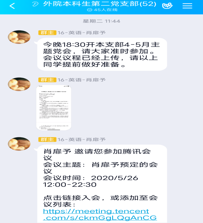 2020年5月26日18点30分,外语学院本科生第二党支部借助腾讯会议平台召开线上主题党日活动,学习了一系列重要文件及习主席重要讲话精神。本次会议围绕“加强作风建设,狠抓工作落实”主题展开,会议由肖扉予同志主持。
