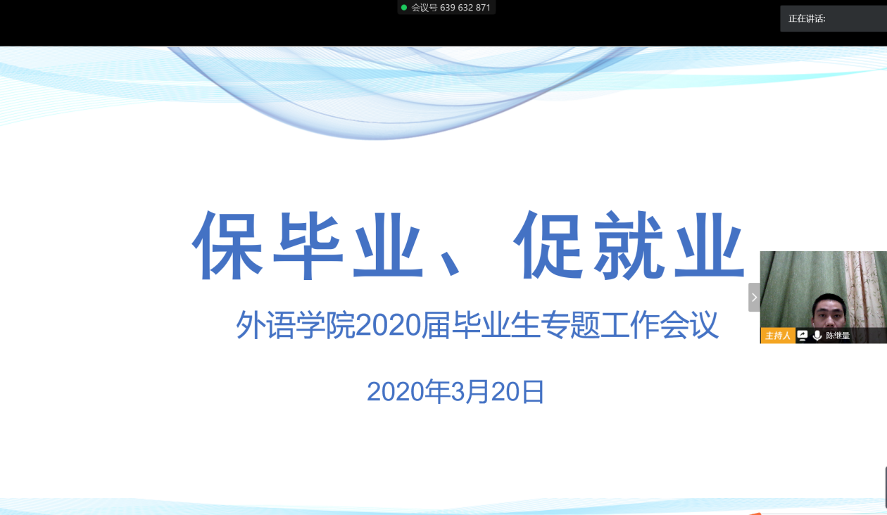 2020年3月20日下午17:00,外语学院2016级通过腾讯会议召开“保毕业,促就业”的专题视频会议,主要围绕2020届毕业生选课上课和毕业生就业两个重要问题展开。会议由2016级辅导员陈继量老师主持,各班班长、团支书及学习委员参会。会议分为“保毕业”和“促就业”两个模块。
