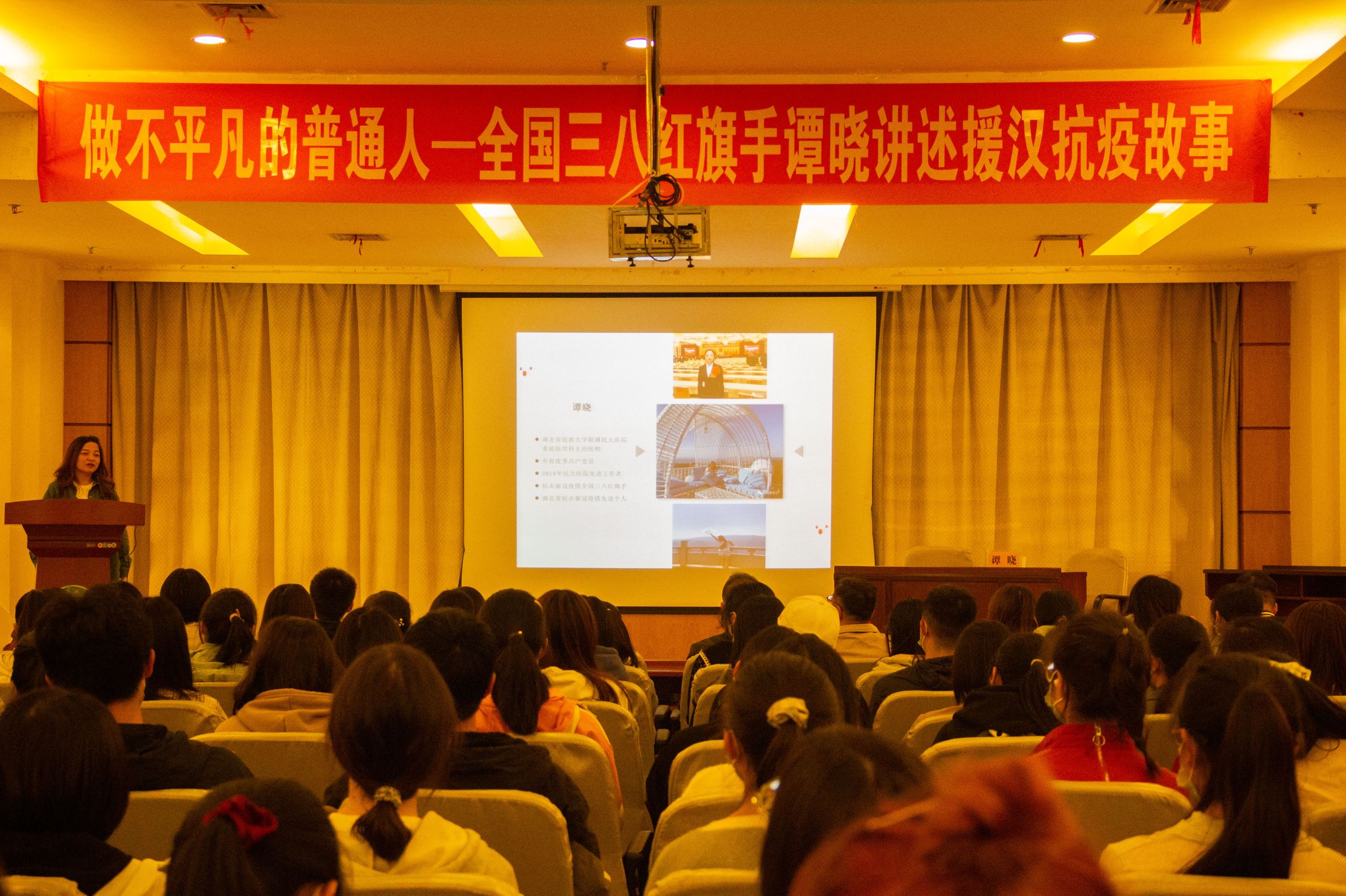 10月24日晚,湖北民族大学附属民大医院重症医学科医生、抗击新冠疫情全国三八红旗手谭晓医生来beat365官网交流,讲述援汉抗疫故事。外语学院党委书记戴迎峰、院长易立新、党委副书记陈晓希、团委书记兼2020级辅导员陈继量出席本次分享会。