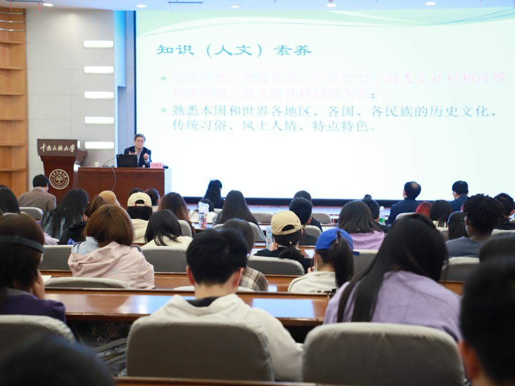 讲座接近尾声时,马燕升参赞进行内容总结,强调国际组织人才需要具备政治素质、专业素质、知识素养、个人素质四种基本素养,以及外语应用能力、交流沟通能力、统筹协调能力、分析研判能力四种能力。