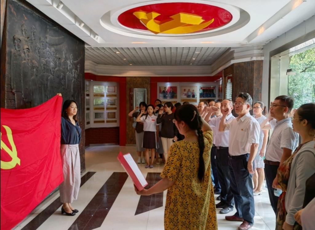 活动伊始,党员们来到报告团荣誉室,由教工第五支部书记舒静领誓,众人面朝着鲜艳的党旗,进行了重温入党誓词仪式。