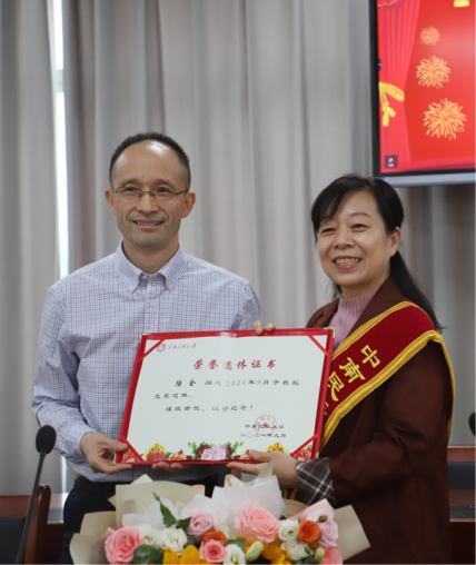 仪式伊始,易立新代表学院党政发言,回顾了陆全老师在我院长达34年的执教生涯,表示了对她多年来始终坚持“无差错,无矛盾,无请假”这一原则的敬佩与赞赏,感谢其任教多年来对学校、学院各方面工作所做出的贡献。教师代表为陆老师敬献了鲜花,易立新向陆全老师颁授荣誉退休证书以及学校发放的纪念品。