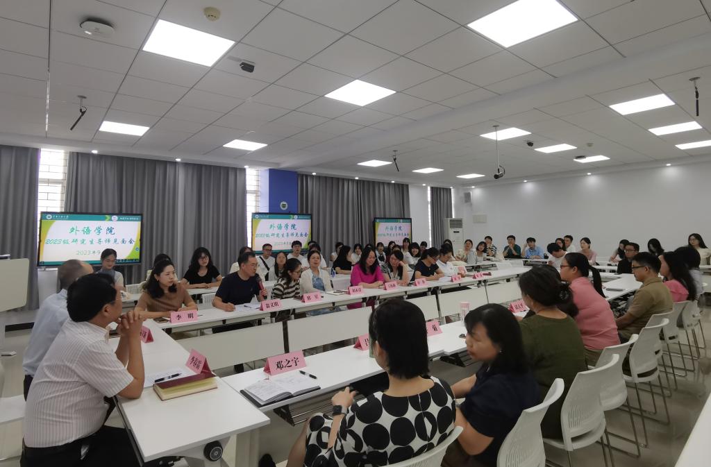 易立新院长代表学院向2023级全体研究生新生表示热烈欢迎并致辞,对出席见面会的导师作了简要介绍;李明副院长介绍了外语学院研究生学位点的发展历程,教学科研成果与师资力量等;学位点负责人翁义明老师和邢星老师分别介绍了外国语言文学学位点和翻译硕士学位点的基本情况、学科特色与培养要求等。在互动提问环节,同学们进一步咨询了专业实习实践、研究生出国交换项目、学术论文发表等问题。