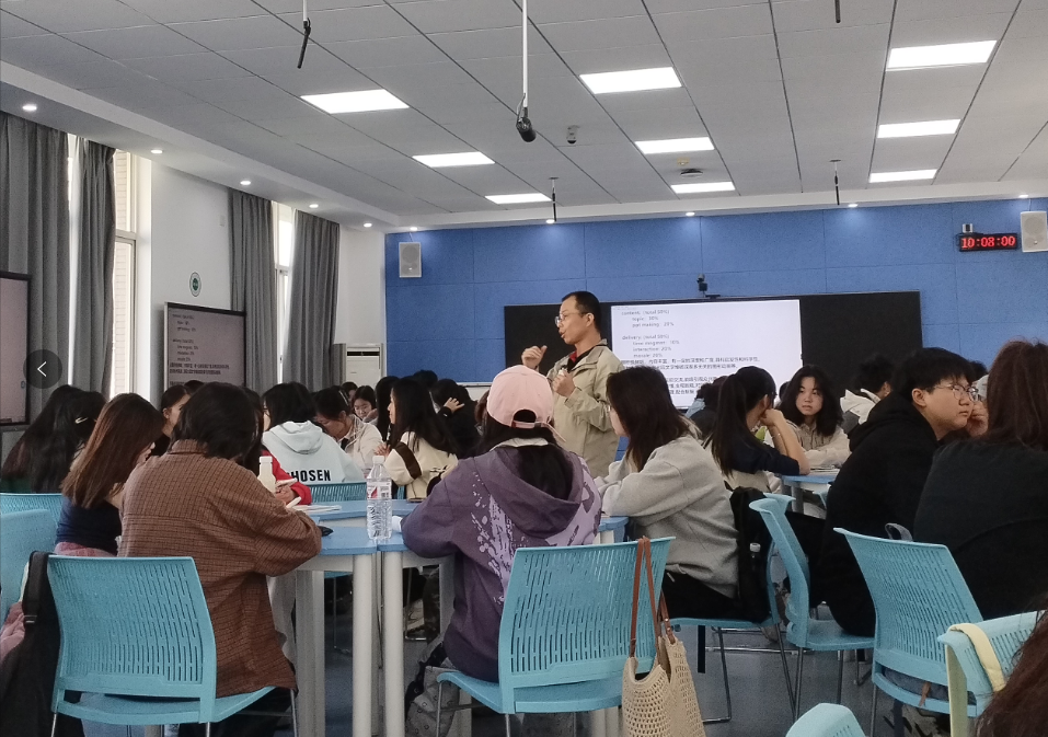 皋峰老师的课堂不局限于教材,教材上的部分内容通过在线学习实现,学生在课上有更多的展示机会。在45分钟的课堂中,首先是学生进行“健康饮食”的主题展示,重点培养学生的团队协作、沟通技能和公共演讲能力。展示结束后同学们对陈述者的内容(主题和PPT制作等)和表现(时间节奏的把握、交流互动和团队配合等)进行了综合点评。