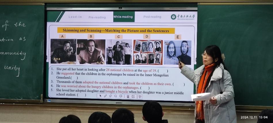 李春雷一行与华容高级中学校长姜胜飞、副校长万利坤、英语教研组全体教师共同观摩了用双语讲授的民族团结进步故事公开课。外语学院大学英语第三教研室主任、党支部书记舒静老师以“三千孤儿入内蒙”为主题,结合英语学习知识点,将民族团结的故事贯穿始终,充分运用现代化教育方法,营造良好课堂气氛,主题鲜明,讲解生动,受到师生的一致好评。这一主题鲜明的双语教学实践,让学生们领悟到民族团结的深远意义,在历史的情感共鸣中增强爱国情怀和社会责任感,充分展现了课程思政的铸魂育人重要功能。