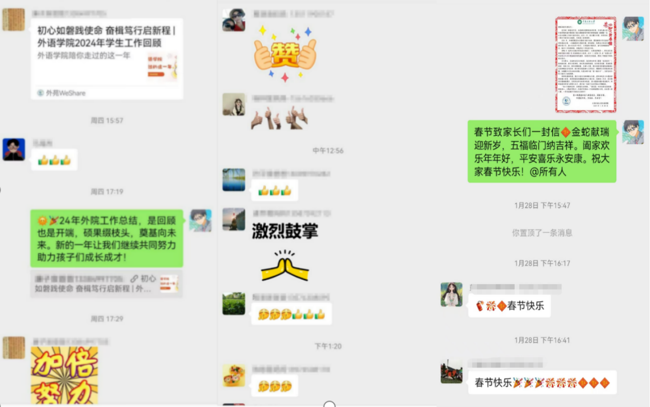 云端家访,育梦起航。学院各年级也通过线上平台多渠道搭建起家校沟通桥梁,落实“云家访”全覆盖。辅导员、班导师开展线上一对一视频家访,与家长进行深入交流,传递学校对学生培养的重视和关爱,认真了解家长期许,帮助学生家长了解学生在校情况;特别组织召开“铸牢中华民族共同体意识 共画家校协同育人同心圆”主题线上家长座谈会,详细介绍学院过去一年所开展的学生工作和取得的突出成绩,为家长答疑解惑,筑牢家校协同育人平台;以短信方式发送“寒假致家长的一封信”、在家长群发送“外语学院2024年学生工作回顾”以及“春节致家长的一封信”,落实育人责任,提升育人温度,拉近家校距离。