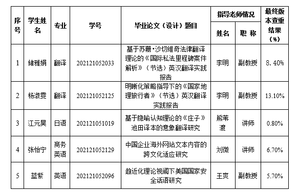 根据学校《关于做好2025届本科生校级优秀毕业论文(设计)评选工作的通知》《beat365英国正版唯一网址本科学生毕业论文(设计)管理办法》相关规定和《外语学院本科生校级优秀毕业论文(设计)评选实施办法》,我院按照公平、公正、公开的原则,对各专业推荐的优秀论文“知网”查重检测结果进行审核,组织答辩和专家匿名外审,最终评选出5篇校级优秀毕业论文,现将2025届本科生校级优秀毕业论文拟推荐名单公示如下: