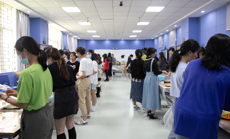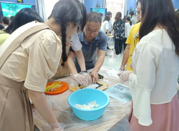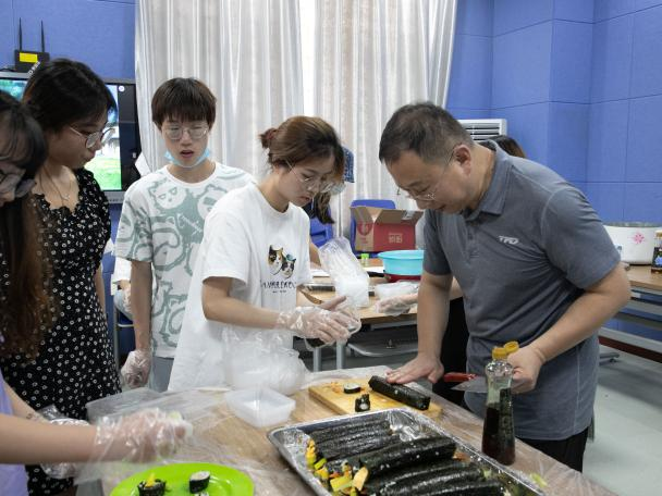 活动开始前,食材和所需工具均已齐备,同学们分为十组,入场后按组别就位,佩戴手套。赵海波老师为同学们进行示范,强调制作要点。制作过程中,各组同学相互配合,动手能力不断提高,友谊不断加深。在此期间,赵海波老师对各组同学进行了耐心指导和“手把手”教学。活动现场气氛活跃热烈,同学们积极动手,欢声笑语,收获满满。