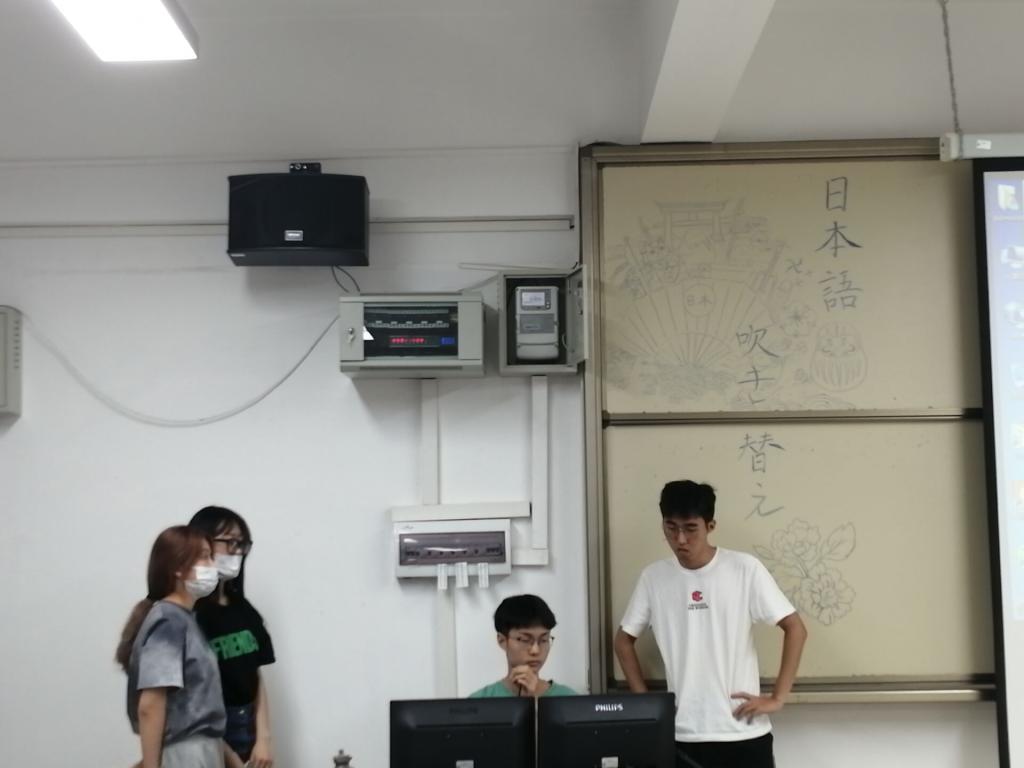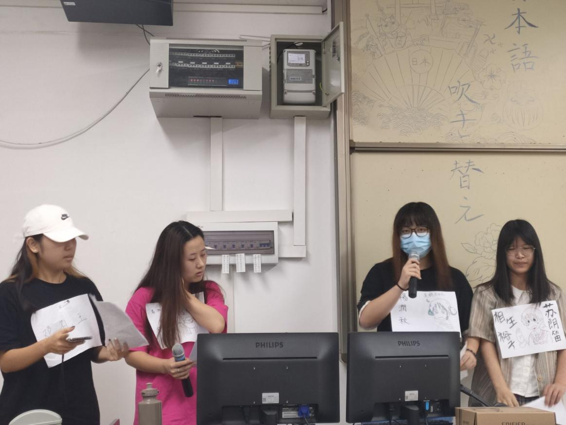 活动伊始,李骁、雷浩泓同学作为活动的主持人,以流利的口语简要介绍了此次活动的主要内容。活动过程中,每个小组以日语做了简短的小组介绍,并将视频投放到大屏幕上以展示本组的配音成果。各小组选择的配音素材各不相同,取自多个不同种类的影视作品,包括动漫、电视剧等。由蔡静、盛莉老师在一旁负责对各组配音成果进行审评。