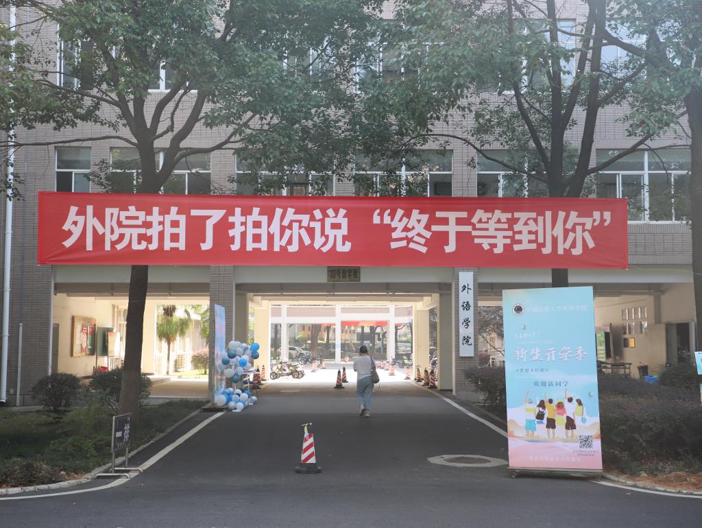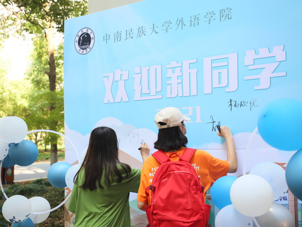 (新生在我院的迎新签名板上签名。 外院学生汇 供图)